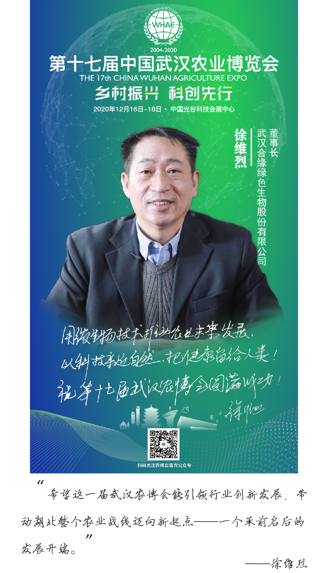 “希望這一屆武漢農(nóng)博會(huì)能引領(lǐng)行業(yè)創(chuàng)新發(fā)展,帶動(dòng)湖北整個(gè)農(nóng)業(yè)戰(zhàn)線(xiàn)邁向新起點(diǎn)——一個(gè)承前啟后的發(fā)展開(kāi)端?!毙炀S烈對(duì)第十七屆武漢農(nóng)博會(huì)充滿(mǎn)期待。徐維烈表示,在第十七屆武漢農(nóng)博會(huì)上,合緣生物將重點(diǎn)展示“植寶露”和“土壤修復(fù)菌劑”等明星產(chǎn)品,以及菌種培養(yǎng)發(fā)酵的突破研究和抗生素菌渣的資源化和無(wú)害化的突破研究等創(chuàng)新技術(shù)成果。
