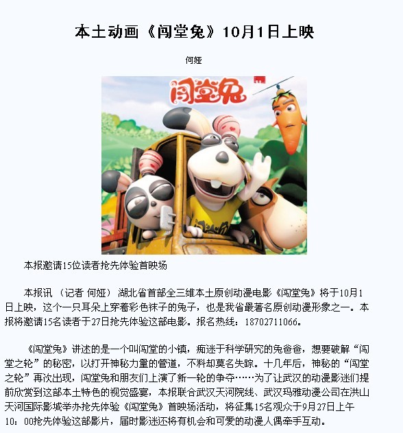 武漢晚報:本土動畫《闖堂兔》10月1日上映