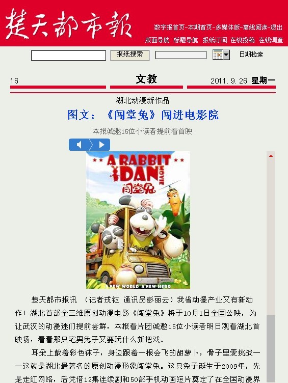 楚天都市報訊?(記者戎鈺?通訊員彭麗云)我省動漫產業(yè)又有新動作!湖北首部全三維原創(chuàng)動漫電影《闖堂兔》將于10月1日全國公映,為讓武漢的動漫迷們提前嘗鮮,本報看片團誠邀15位小讀者明日觀看湖北首映場,看看那只宅男兔子又要玩什么新把戲。