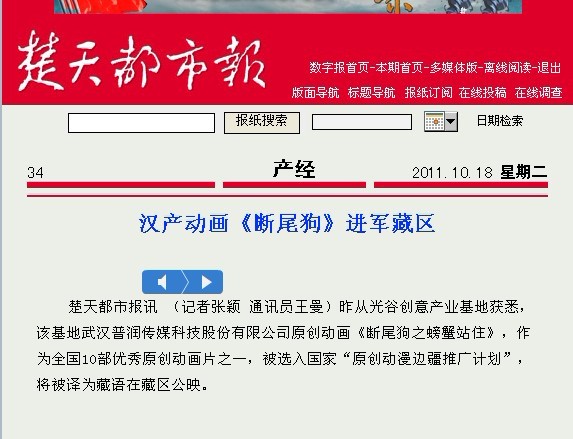 楚天都市報(bào)訊?(記者張穎?通訊員王曼)昨從光谷創(chuàng)意產(chǎn)業(yè)基地獲悉,該基地武漢普潤傳媒科技股份有限公司原創(chuàng)動(dòng)畫《斷尾狗之螃蟹站住》,作為全國10部優(yōu)秀原創(chuàng)動(dòng)畫片之一,被選入國家“原創(chuàng)動(dòng)漫邊疆推廣計(jì)劃”,將被譯為藏語在藏區(qū)公映。
