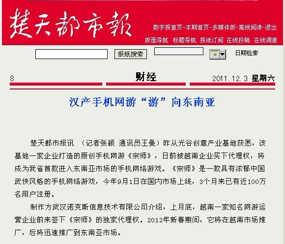 制作方武漢諾克斯信息技術有限公司介紹,上月底,越南一家知名網(wǎng)游運營企業(yè)前來簽下《宗師》的獨家代理權。2012年新春期間,它將在越南市場推廣,后將迅速推廣到東南亞市場。