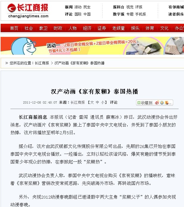 長江商報消息?本報訊(記者 雷闖 通訊員 薛寒冰)昨日,武漢動漫協(xié)會傳出好消息,漢產(chǎn)動畫片《家有漿糊》搬上了泰國中央中文電視臺,并受到了泰國小朋友的熱捧,該片將播放至明年2月5日。