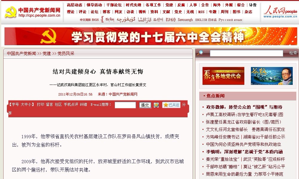他就是武漢市委今年七一表彰的100名優(yōu)秀黨務工作者之一,武漢高科集團公司駐江夏區(qū)法泗鎮(zhèn)永豐村、舒安鄉(xiāng)官山村駐村工作組組長,市儀表電子學校副校長黃賢文。