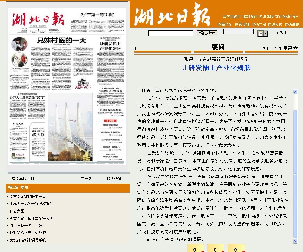 張昌爾一行先后考察了國家光電子信息產(chǎn)品質(zhì)量監(jiān)督檢驗中心、華新水泥股份有限公司、蘭丁醫(yī)學(xué)高科技有限公司、藥明康德新藥開發(fā)有限公司和武漢生物技術(shù)研究院等單位。蘭丁公司創(chuàng)辦人、歸僑孫小蓉介紹,該公司開發(fā)的全球唯一的全自動癌細胞診斷系統(tǒng),改變了人類130多年來依靠專家用顯微鏡診斷癌癥的歷史,診斷準確率高達80%,市場前景非常廣闊。張昌爾很感興趣,詳細了解有關(guān)情況,并叮囑有關(guān)部門負責(zé)同志,要加大對企業(yè)的政策扶持和服務(wù)力度,拓寬市場,把企業(yè)做大做強。