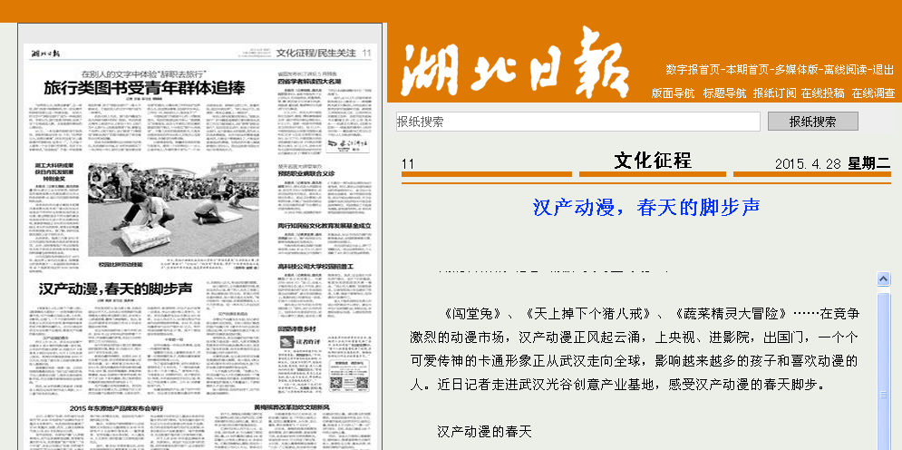 ? ? ? ? 新聞動漫同樣精彩。在楚天181文化創(chuàng)意產(chǎn)業(yè)園,武漢首家新聞動漫公司楚天尚漫,如一顆新星正冉冉升起。2014年,楚天尚漫就發(fā)布原創(chuàng)新聞動漫作品3291篇,包括單幅漫畫、多幅多格微漫畫、flash動畫短片等多種體裁,制作了近126個系列漫畫,簽訂獨家授權(quán)的漫畫和版權(quán)授權(quán)的游戲各1個。
