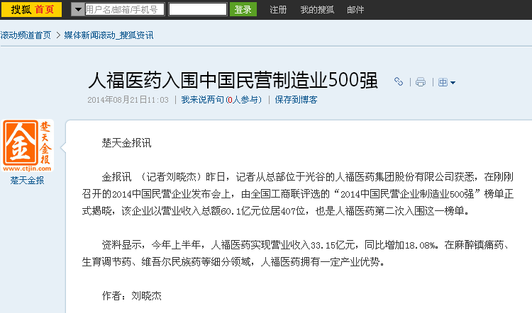 金報訊 (記者劉曉杰)昨日,記者從總部位于光谷的人福醫(yī)藥集團股份有限公司獲悉,在剛剛召開的2014中國民營企業(yè)發(fā)布會上,由全國工商聯(lián)評選的“2014中國民營企業(yè)制造業(yè)500強”榜單正式揭曉,該企業(yè)以營業(yè)收入總額60.1億元位居407位,也是人福醫(yī)藥第二次入圍這一榜單。