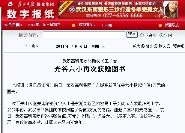 本報訊(通訊員江博)前日,武漢高科集團向東湖高新區(qū)光谷六小捐贈價值1萬元的圖書。