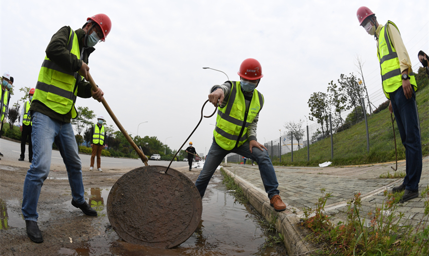 4月22日,施工人員對(duì)武漢光谷華星光電外部道路排水管網(wǎng)進(jìn)行疏通。面對(duì)即將來臨的汛期,武漢高科組建防汛抗旱應(yīng)急組,對(duì)武漢光谷重要企業(yè)所在的18條市政道路排水管網(wǎng),以及還建社區(qū)近2700個(gè)檢查井、220個(gè)雨水篦子進(jìn)行全面檢查維護(hù),確保平安度汛。(湖北日?qǐng)?bào)全媒記者 田悅 通訊員 張代瑋 攝)