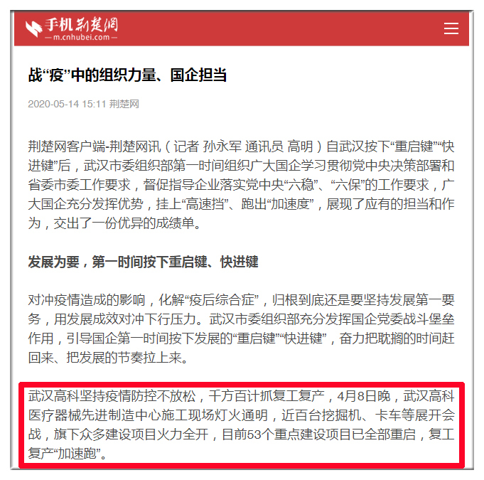荊楚網(wǎng)客戶端-荊楚網(wǎng)訊(記者 孫永軍 通訊員 高明)自武漢按下“重啟鍵”“快進(jìn)鍵”后,武漢市委組織部第一時間組織廣大國企學(xué)習(xí)貫徹黨中央決策部署和省委市委工作要求,督促指導(dǎo)企業(yè)落實(shí)黨中央“六穩(wěn)”、“六?!钡墓ぷ饕?,廣大國企充分發(fā)揮優(yōu)勢,掛上“高速擋”、跑出“加速度”,展現(xiàn)了應(yīng)有的擔(dān)當(dāng)和作為,交出了一份優(yōu)異的成績單。
