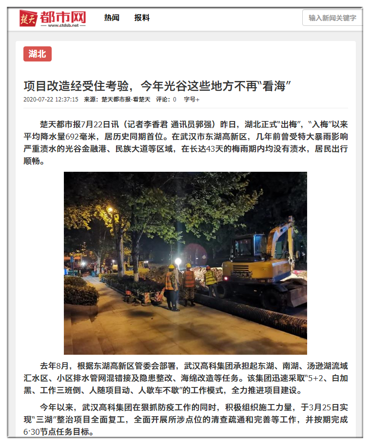 去年8月,根據(jù)東湖高新區(qū)管委會(huì)部署,武漢高科集團(tuán)承擔(dān)起東湖、南湖、湯遜湖流域匯水區(qū)、小區(qū)排水管網(wǎng)混錯(cuò)接及隱患整改、海綿改造等任務(wù)。該集團(tuán)迅速采取“5+2、白加黑、工作三班倒、人隨項(xiàng)目動(dòng)、人歇車不歇”的工作模式,全力推進(jìn)項(xiàng)目建設(shè)。