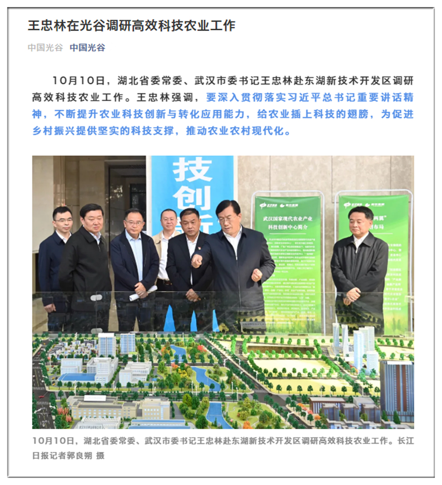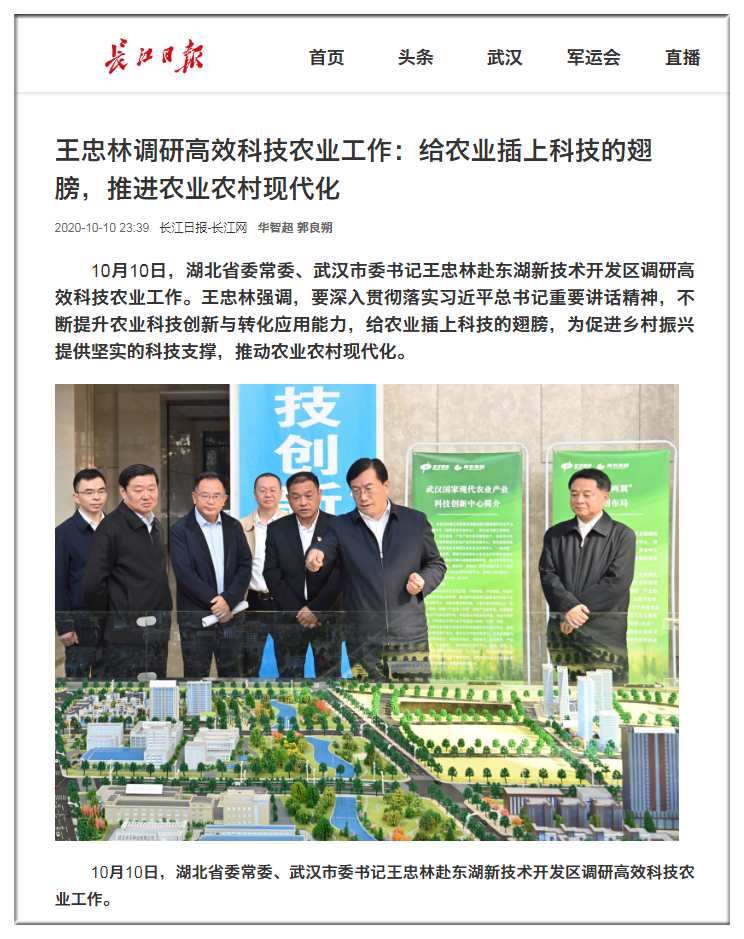 長江日報-長江網(wǎng):王忠林調研高效科技農業(yè)工作:給農業(yè)插上科技的翅膀,推進農業(yè)農村現(xiàn)代化
