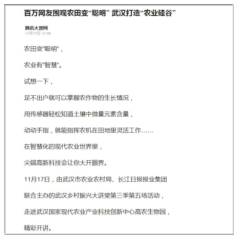 騰訊大楚網(wǎng):百萬網(wǎng)友圍觀農(nóng)田變“聰明”?武漢打造“農(nóng)業(yè)硅谷”