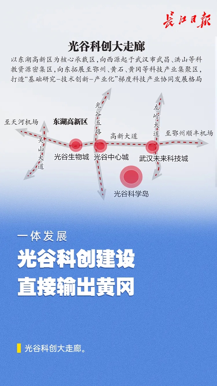 光谷科創(chuàng)大走廊以東湖高新區(qū)為核心承載區(qū),向西源起于武漢市武昌、洪山等科教資源密集區(qū),向東拓展至鄂州、黃石、黃岡等科技產(chǎn)業(yè)集聚區(qū),打造“基礎(chǔ)研究—技術(shù)創(chuàng)新—產(chǎn)業(yè)化”梯度科技產(chǎn)業(yè)協(xié)同發(fā)展格局。