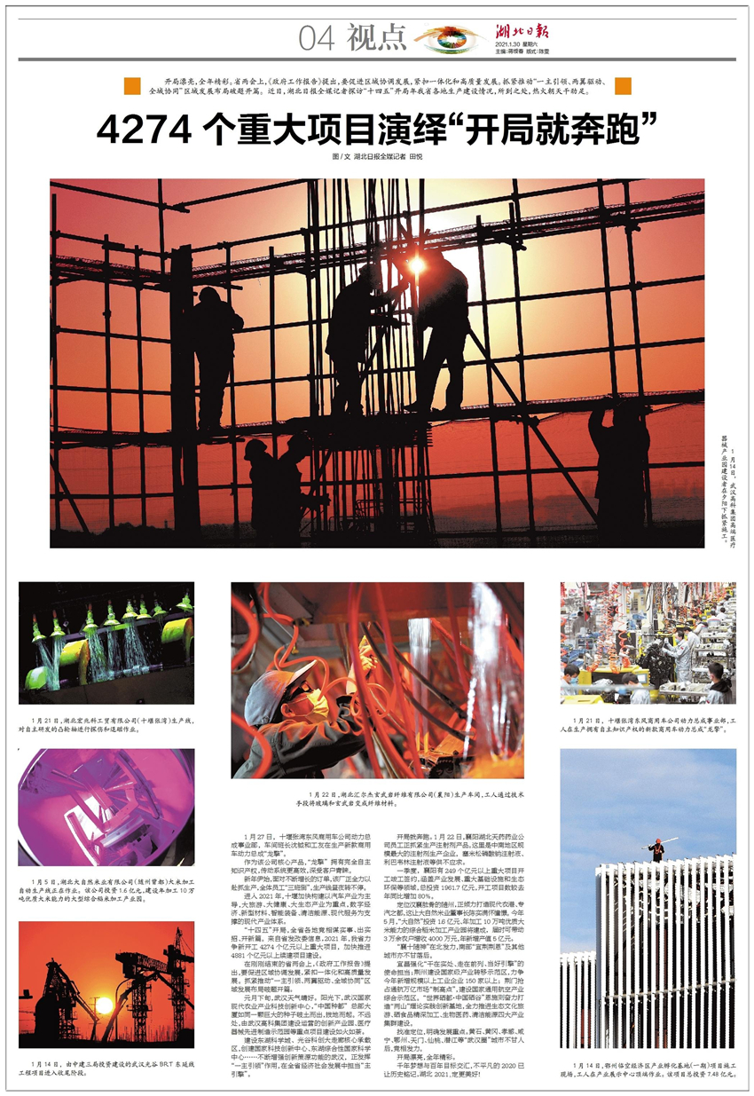 開(kāi)局漂亮,全年精彩。省兩會(huì)上,《政府工作報(bào)告》提出,要促進(jìn)區(qū)域協(xié)調(diào)發(fā)展,緊扣一體化和高質(zhì)量發(fā)展。抓緊推動(dòng)“一主引領(lǐng)、兩翼驅(qū)動(dòng)、全域協(xié)同”區(qū)域發(fā)展布局破題開(kāi)篇。近日,湖北日?qǐng)?bào)全媒記者探訪(fǎng)“十四五”開(kāi)局年我省各地生產(chǎn)建設(shè)情況,所到之處,熱火朝天干勁足。