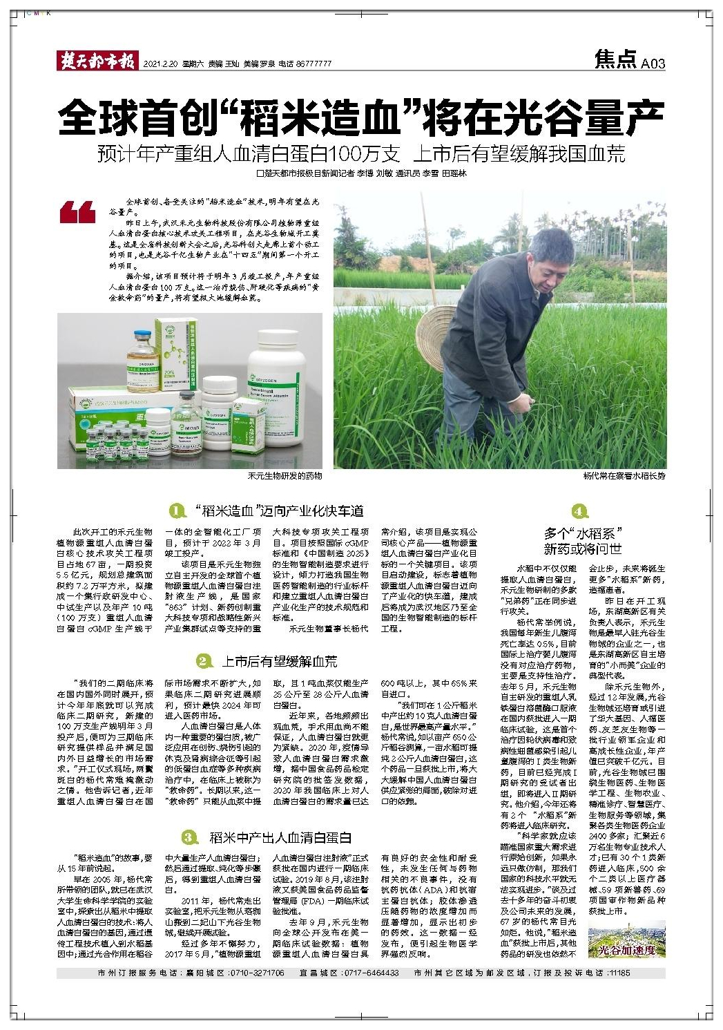全球首創(chuàng)、備受關(guān)注的“稻米造血”技術(shù),明年有望在光谷量產(chǎn)。