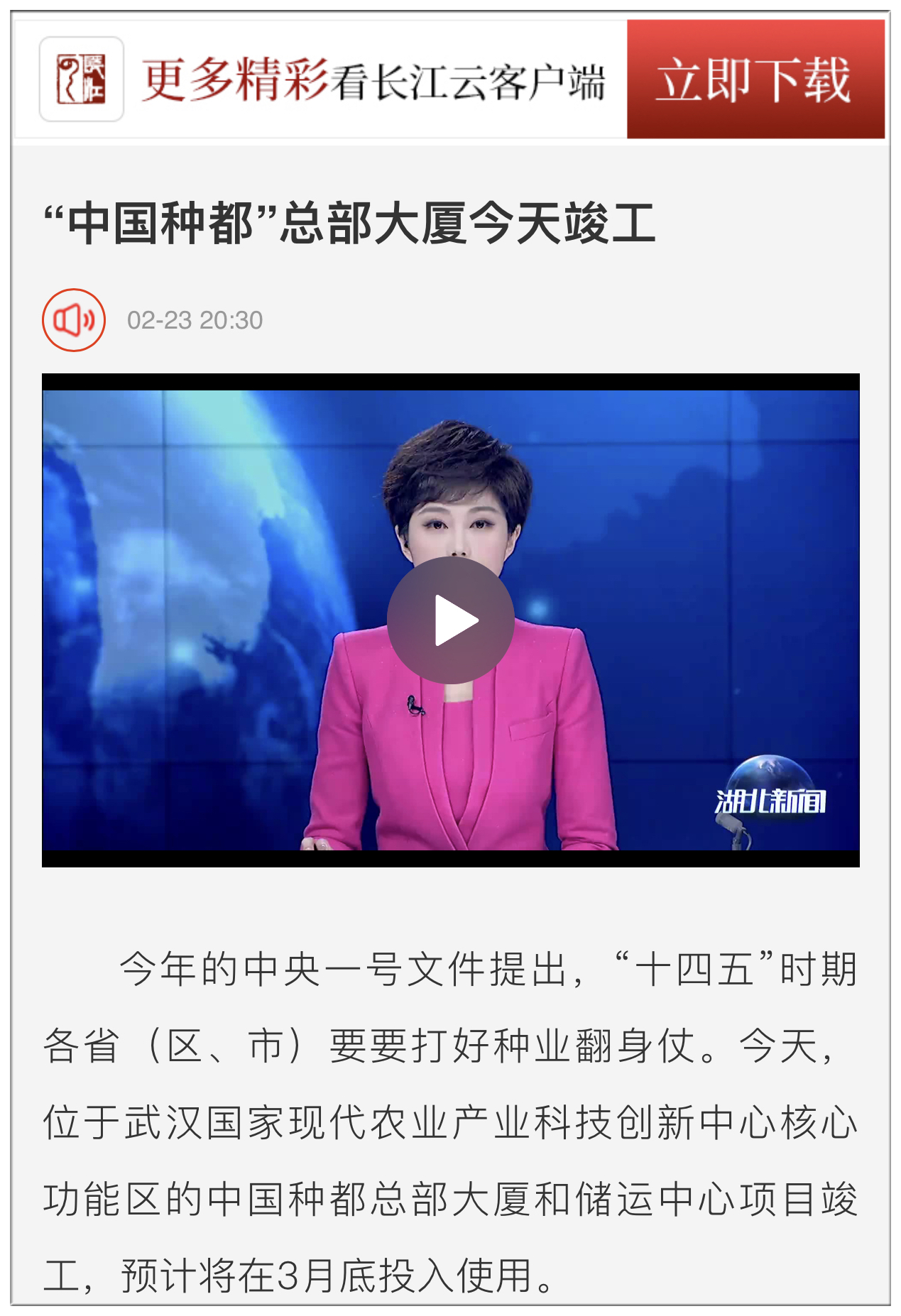 今年的中央一號文件提出,“十四五”時期各?。▍^(qū)、市)要要打好種業(yè)翻身仗。今天,位于武漢國家現(xiàn)代農(nóng)業(yè)產(chǎn)業(yè)科技創(chuàng)新中心核心功能區(qū)的中國種都總部大廈和儲運中心項目竣工,預(yù)計將在3月底投入使用。
