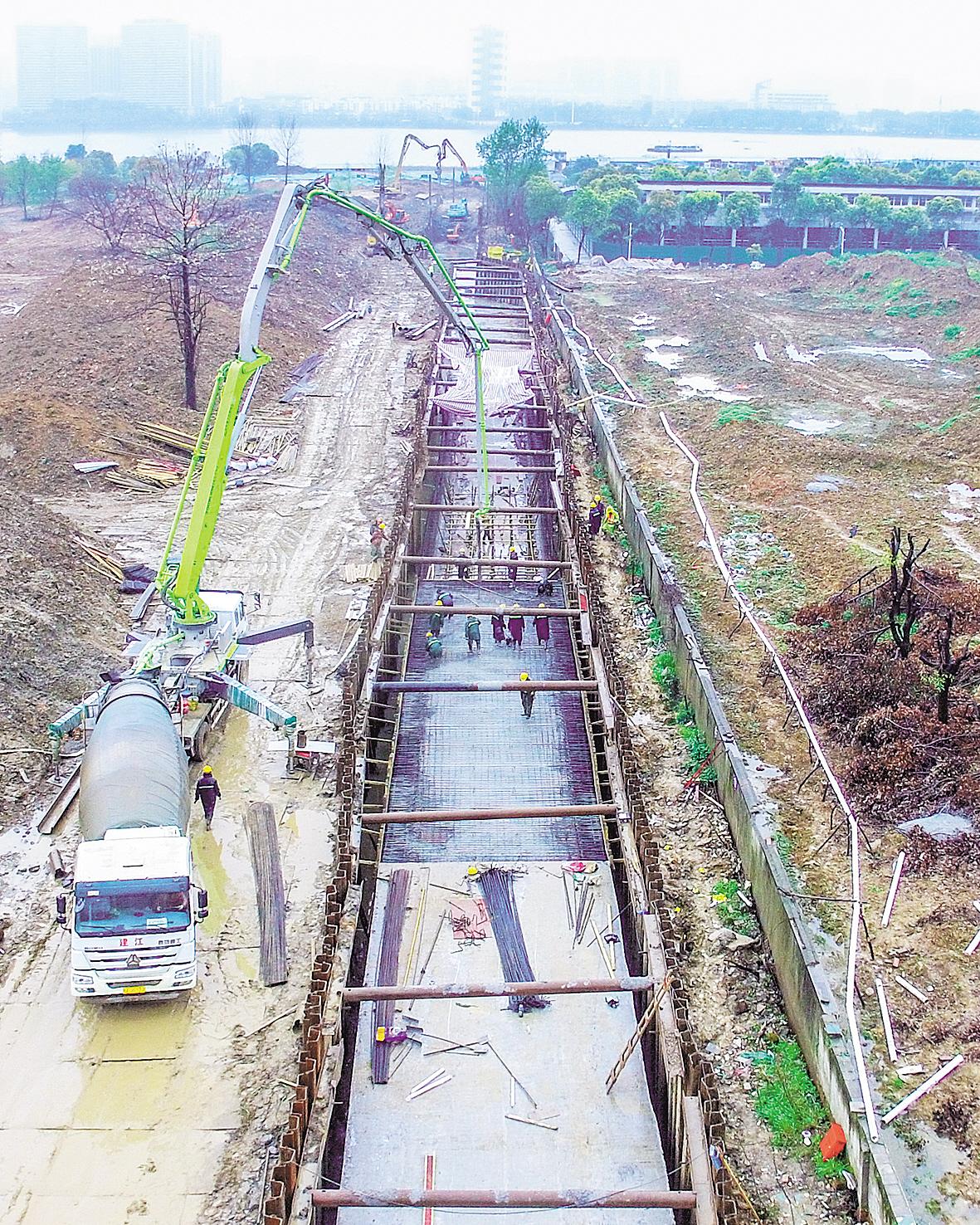 3月18日,建設(shè)者們冒雨加緊排水箱涵施工。武漢去年汛后42處漬水風(fēng)險(xiǎn)較大點(diǎn)位整治,目前已完成34處,其中備受關(guān)注的洪山區(qū)虎泉街保利華都點(diǎn)位的整治正在加快推進(jìn),沖刺最后600米排水箱涵建設(shè),預(yù)計(jì)4月底完工,趕在汛前投入使用。(湖北日?qǐng)?bào)全媒記者 梅濤 攝)