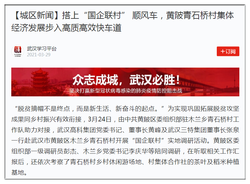 “脫貧摘帽不是終點,而是新生活、新奮斗的起點。”為實現(xiàn)鞏固拓展脫貧攻堅成果同鄉(xiāng)村振興有效銜接,3月24日,由中共黃陂區(qū)委組織部駐木蘭鄉(xiāng)青石橋村工作隊助力對接,武漢高科集團黨委書記、董事長黃峰及武漢三特集團董事長張泉一行赴武漢市黃陂區(qū)木蘭鄉(xiāng)青石橋村開展“國企聯(lián)村”實地調研活動。黃陂區(qū)委組織部一級調研員彭杰、木蘭鄉(xiāng)黨委書記李慶華等陪同調研,在聽取相關工作匯報后,還依次考察了青石橋村鄉(xiāng)村休閑游場地、村集體合作社的茶葉及稻米種植基地。