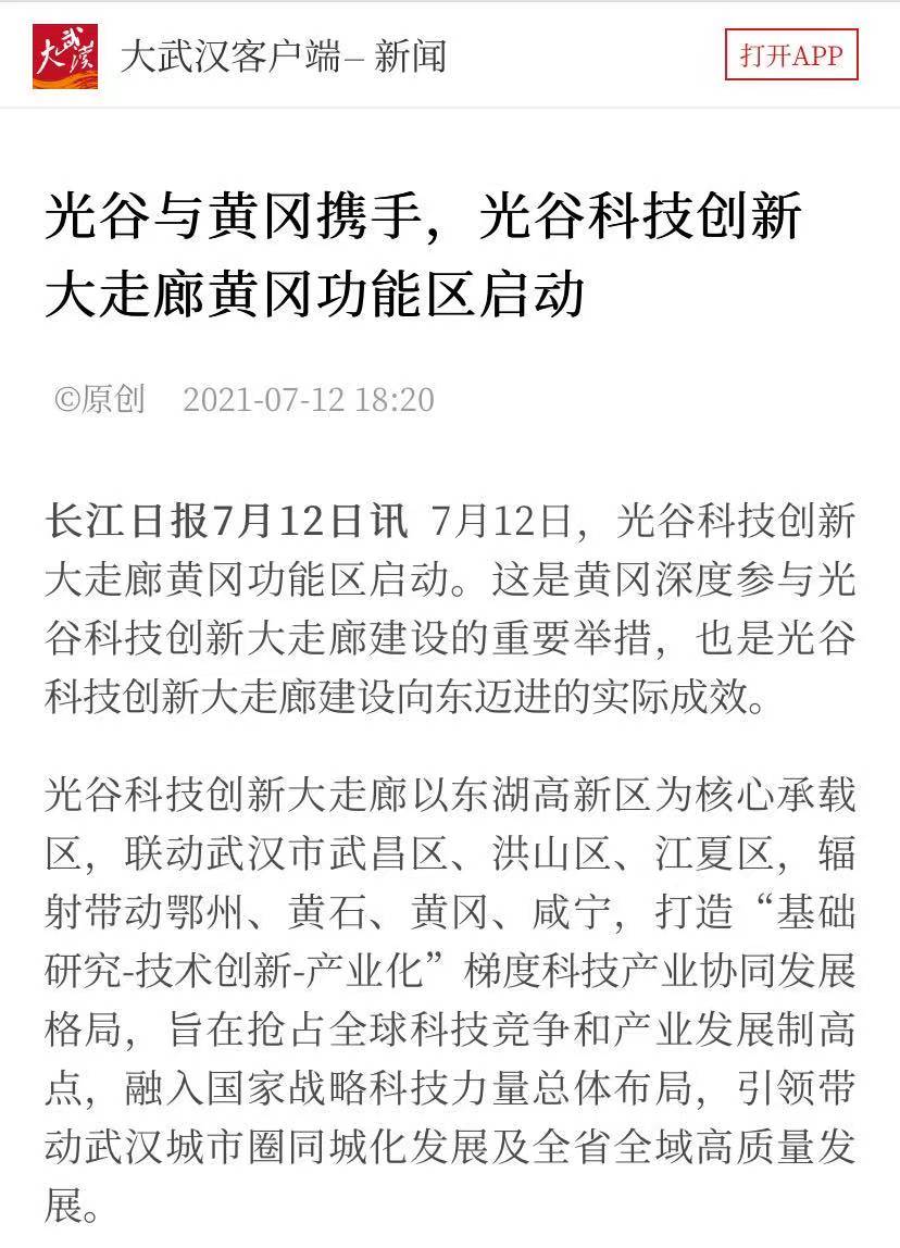 長(zhǎng)江日?qǐng)?bào)大武漢客戶端 :《光谷與黃岡攜手,光谷科技創(chuàng)新大走廊黃岡功能區(qū)啟動(dòng)》