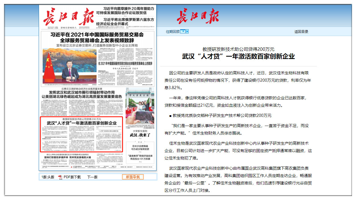 佳禾生物得知建行推出了“人才貸”,剛好公司引入的主要研發(fā)人員2018年入選了“3551光谷人才計(jì)劃”,是政府認(rèn)定的高科技人才。這位人才是一位教授,專業(yè)指導(dǎo)公司完成優(yōu)質(zhì)雜交中粳甬優(yōu)4949高產(chǎn)高效保優(yōu)栽培技術(shù)創(chuàng)新研究,提高了種糧農(nóng)民的效益,符合“人才貸”的貸款條件。