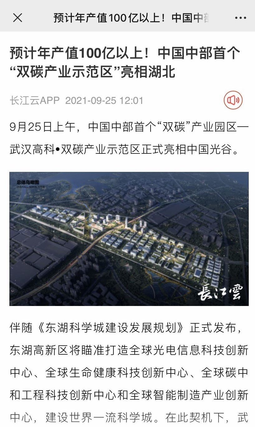2020年,光谷獲批成為全國首批22個“科創(chuàng)中國”試點園區(qū)之一。當(dāng)前正值我國“2030年碳達峰,2060年碳中和”目標提出1周年,“雙碳”產(chǎn)業(yè)已納入湖北東湖科學(xué)城發(fā)展規(guī)劃,成為重要產(chǎn)業(yè)方向之一。