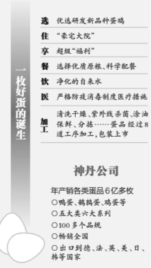 “我們的蛋雞都住著‘豪宅大院’,享受著超級‘福利’,以保證蛋品品質?!鄙竦す径麻L劉華橋說,公司基地里的每只雞飼養(yǎng)面積約0.4平方米,是普通籠養(yǎng)蛋雞的7倍,使蛋雞有吮毛、沙浴、運動、交配的自由;選擇優(yōu)質原糧、科學配餐,飲用凈化后的自來水;杜絕使用抗生素,實現(xiàn)家禽‘無抗養(yǎng)殖’,嚴格執(zhí)行防疫消毒制度,醫(yī)療措施和飼料安全保障遠勝于普通放養(yǎng)蛋雞。