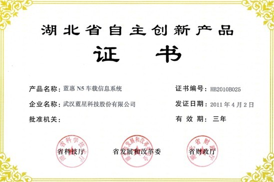 8月8日,武漢藍星科技股份有限公司“藍惠N5車載信息系統(tǒng)”榮獲由湖北省科學技術廳、湖北省發(fā)展和改革委員會和湖北省財政廳聯(lián)合評定為“湖北省自主創(chuàng)新產(chǎn)品”,并頒發(fā)證書(證書編號:HB2010B025)。